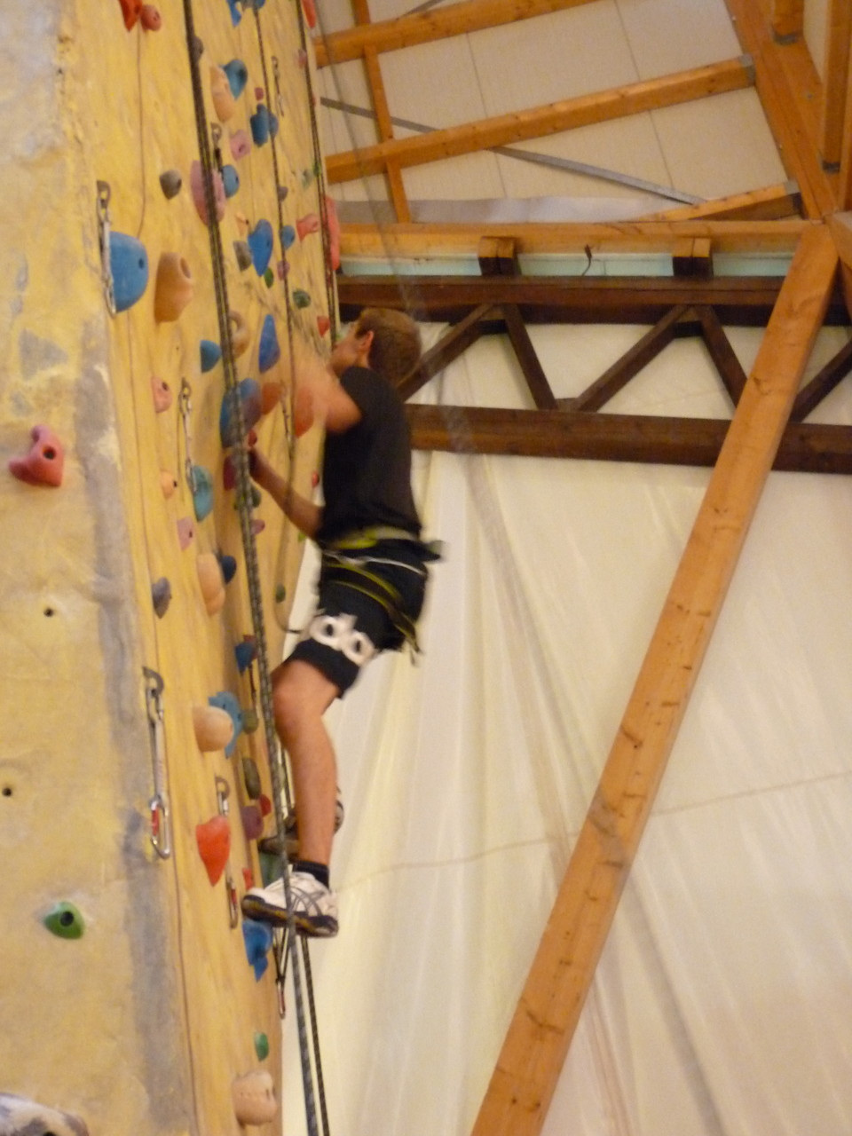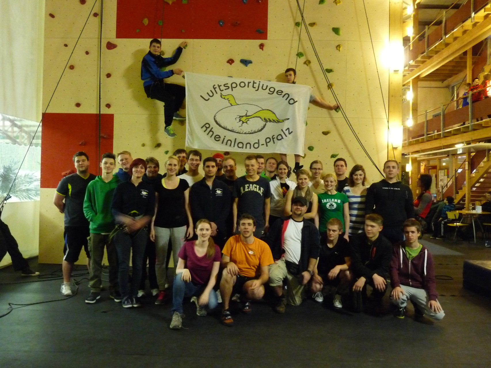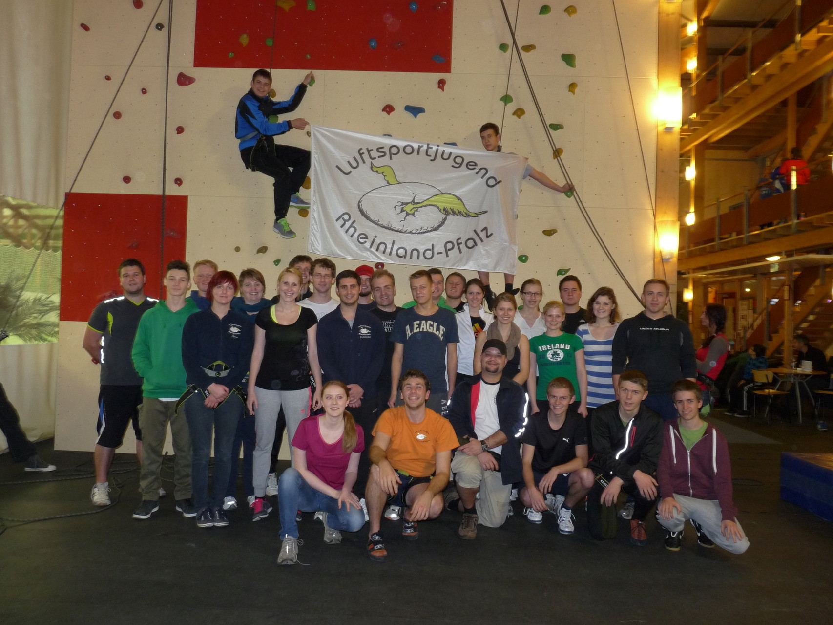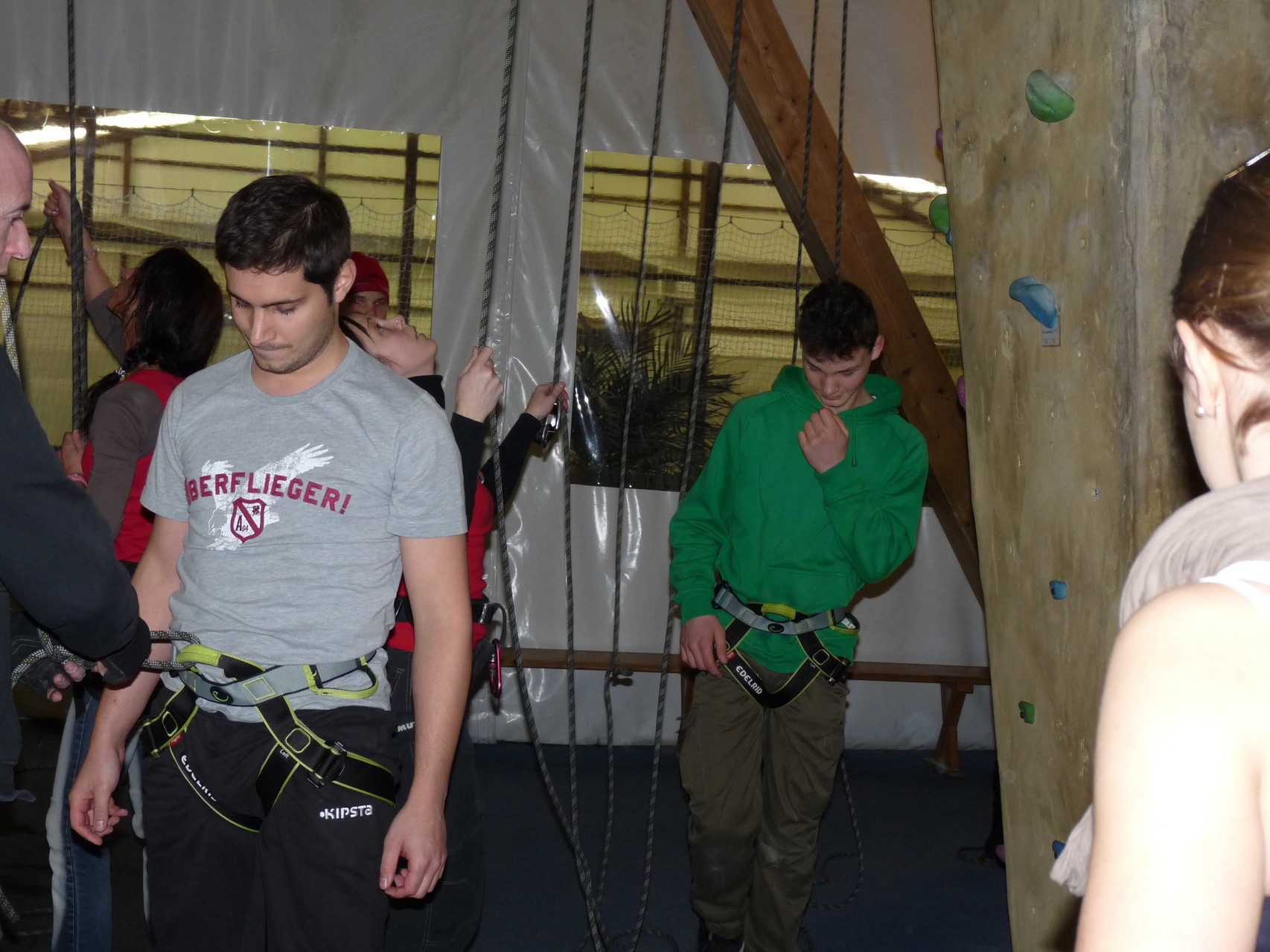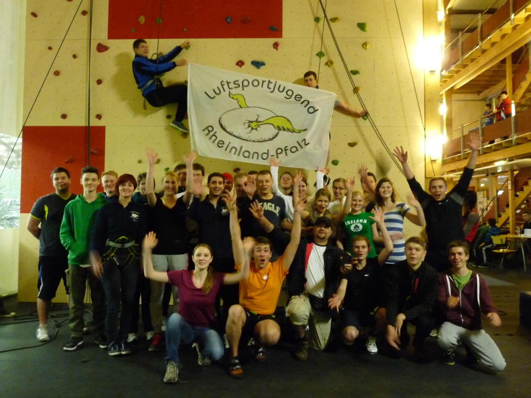 Nach dem Mittagessen fuhren sie zur Kletterhalle. Somit hatten sie trotz Regen keine Einschränkungen. Nach einer kurzen Einweisung in die Kletterausrüstung konnten die ersten schon damit anfangen den „Gipfel“ zu erklimmen. Damit es niemanden langweilig wurde, gab es unterschiedliche Schwierigkeitsgrade. Gegen spätem Nachmittag verließ die Jugend die Halle und fuhr zurück zum Flugplatz. Ein wenig später trafen auch die Pizzen ein. Den Abend ließen sie dann gemütlich im Jugendraum ausklingen. Ein durchaus gelungener Tag!