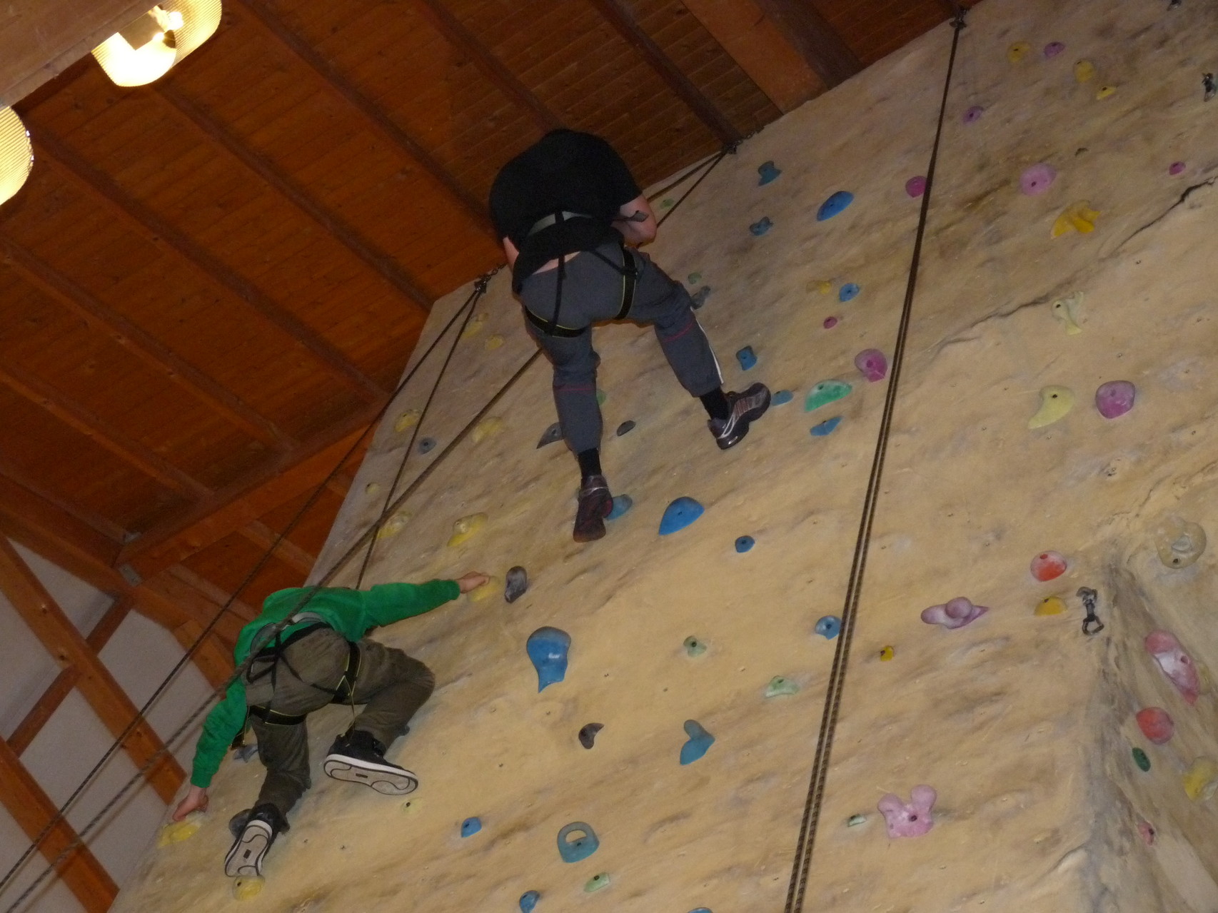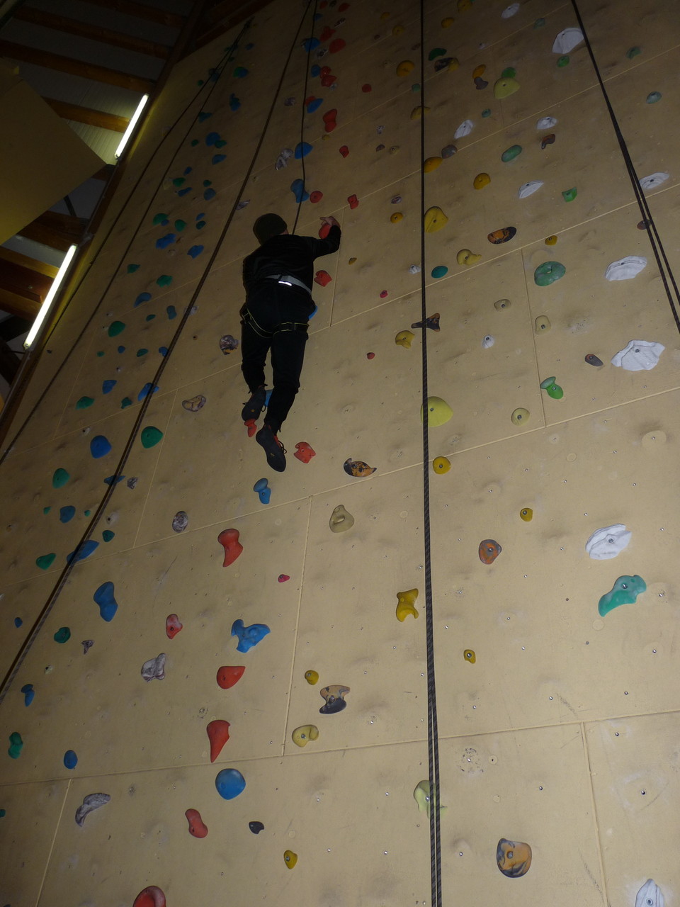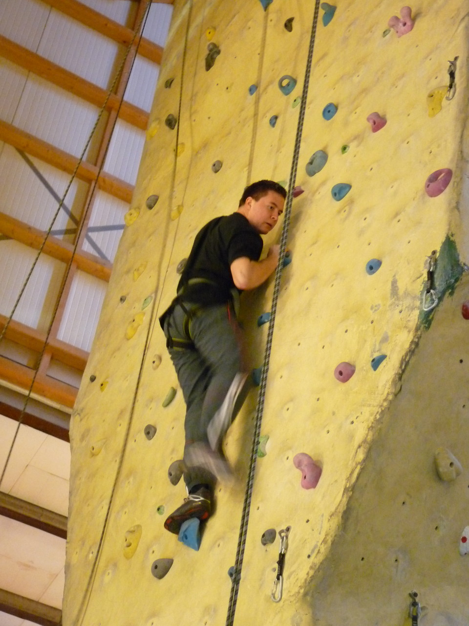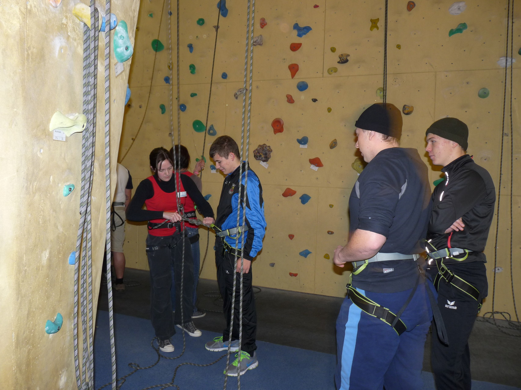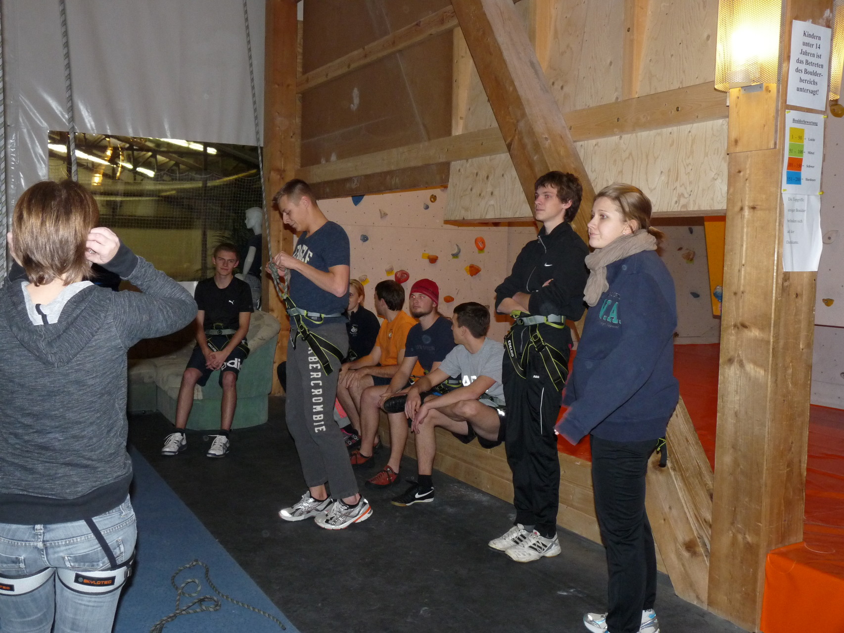 Nach dem Mittagessen fuhren sie zur Kletterhalle. Somit hatten sie trotz Regen keine Einschränkungen. Nach einer kurzen Einweisung in die Kletterausrüstung konnten die ersten schon damit anfangen den „Gipfel“ zu erklimmen. Damit es niemanden langweilig wurde, gab es unterschiedliche Schwierigkeitsgrade. Gegen spätem Nachmittag verließ die Jugend die Halle und fuhr zurück zum Flugplatz. Ein wenig später trafen auch die Pizzen ein. Den Abend ließen sie dann gemütlich im Jugendraum ausklingen. Ein durchaus gelungener Tag!